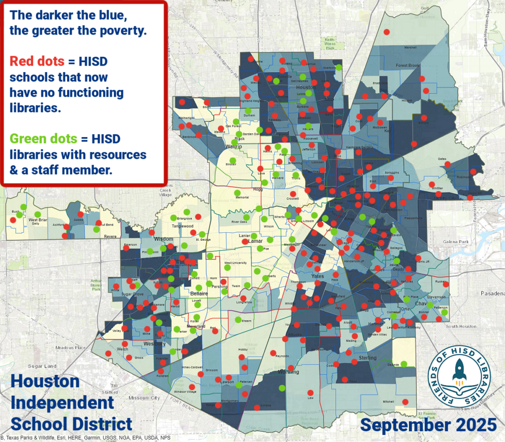In June 2023, the Texas Education Agency assumed control of HISD and the new superintendent immediately began closing libraries. As of October 2025, at least 185 HISD campuses no longer have functioning libraries. Most of these schools are in high-poverty areas, where students have few, if any, reading resources at home.